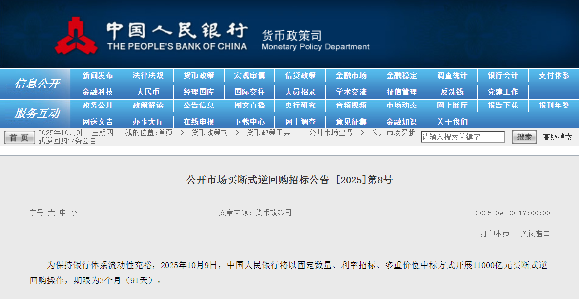 为保持银行体系流动性充裕,2025年10月9日,中国人民银行以固定数量、利率招标、多重价位中标方式开展11000亿元买断式逆回购操作,期限为3个月(91天)。数据显示,10月份将有8000亿元3个月期买断式逆回购到期。由此,中国人民银行今日开展11000亿元买断式逆回购操作,意味着10月份3个月期买断式逆回购加量续作3000亿元。