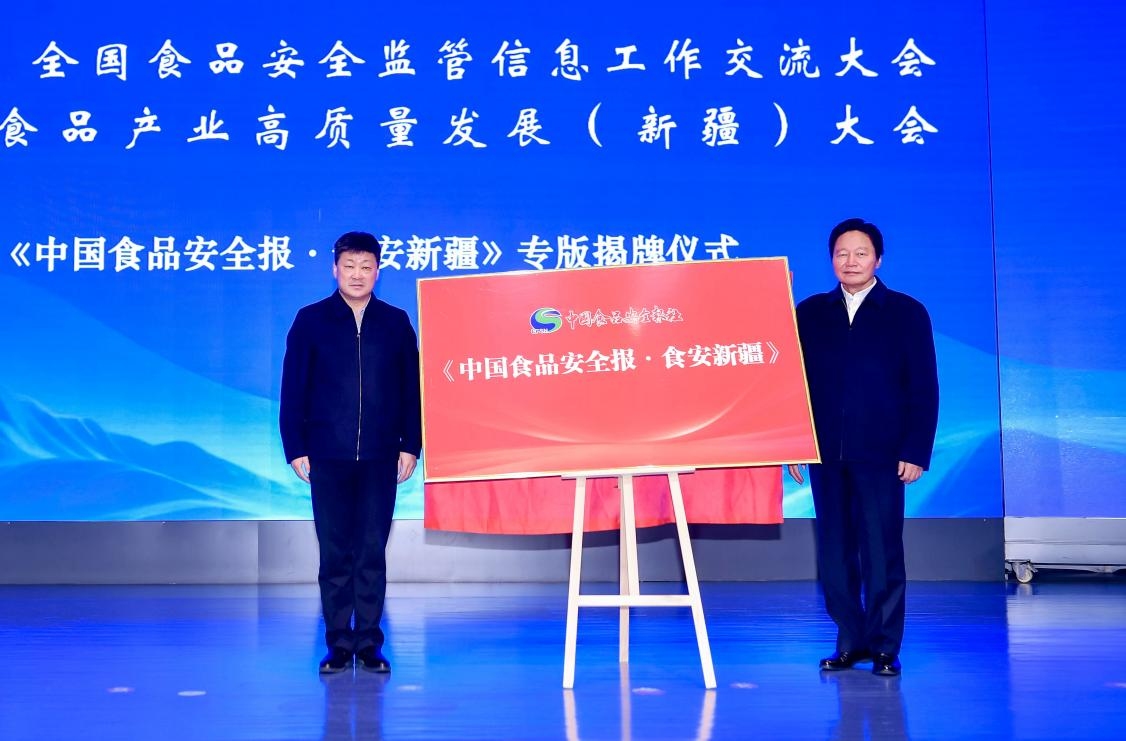 中国食品工业协会副会长、中国食品安全报社社长朱长学与新疆维吾尔自治区市场监督管理局党组书记朱新为《中国食品安全报·食安新疆》专版揭牌。
