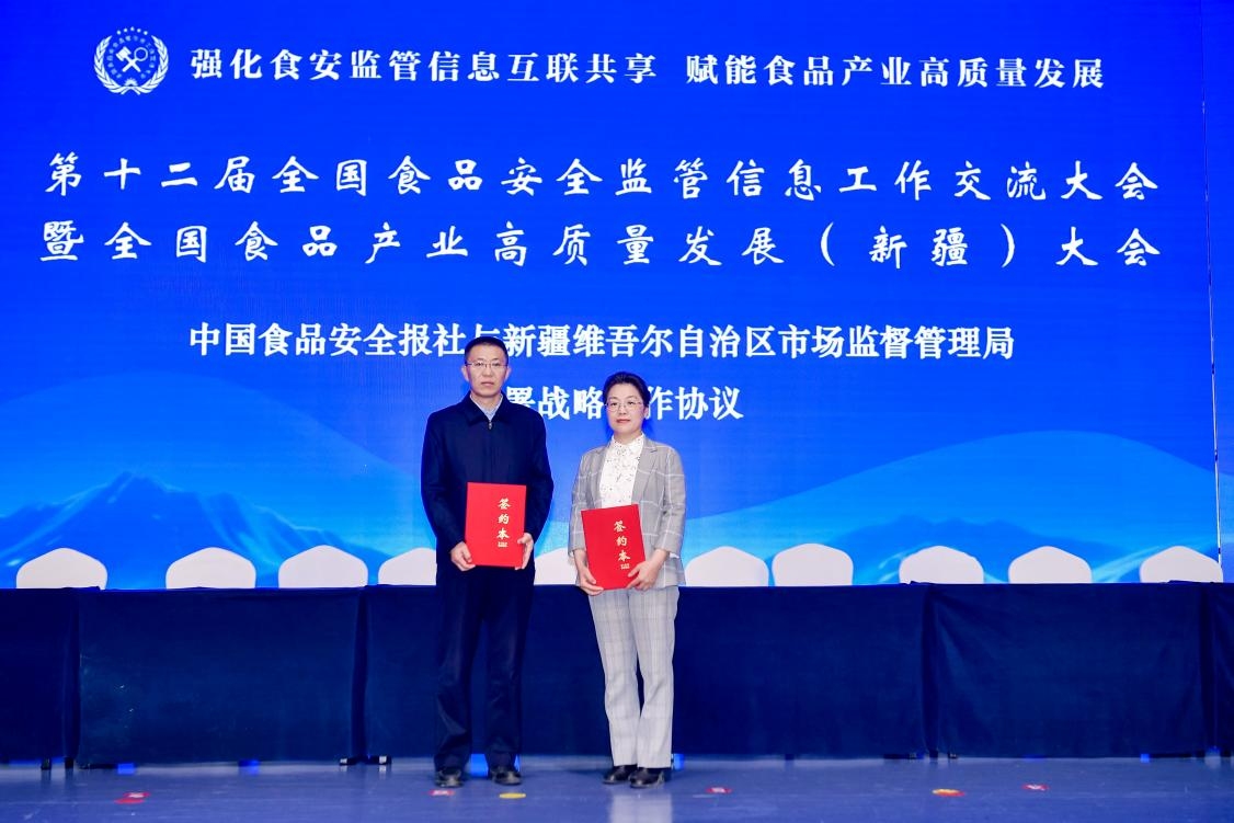 中国食品安全报社总编辑李涛和新疆维吾尔自治区市场监管局副局长左新敏代表双方签订战略合作协议。