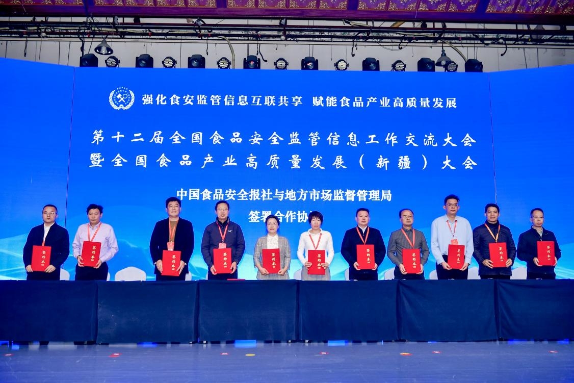 会上公布了2025年度“推进食品安全社会共治”优秀案例、“优化营商环境赋能食品产业高质量发展”优秀案例,“食品安全先进管理经验”优秀个人等内容,启动了《中国食品安全报·食安新疆》专版。同期,本报社与新疆维吾尔自治区市场监管局及11家地市级市场监管局签署合作协议,发布了“食品安全社会共治暨食品产业高质量发展(新疆)倡议”,并启动了2026年食品安全监管系统“强监管促食品产业高质量发展”微视频大赛。