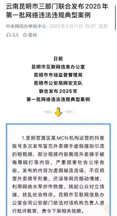 昆明有关部门处罚摆拍骑手内容引流的MCN机构。来源:中央网信办举报中心机构媒体也要坚守专业立场,拒绝被公众情绪和平台算法带着走,正确认识骑手高关注度背后是情绪而非事实在推动,扮演事实传递者而不是情绪助推者。
